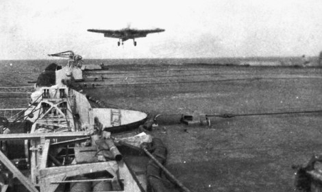 A Fairey Barracuda approaches to land on an Illustrious-class carrier