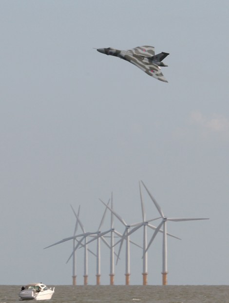 The Vulcan positioning between display manoeuvres over the Gunfleet Sands windfarm, a distinctive sight unique to Clacton