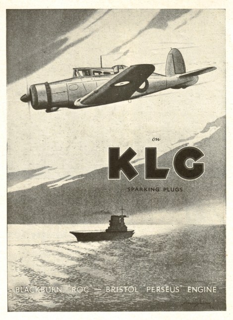An advert for KLG Spark Plugs featuring the Blackburn Roc turret fighter