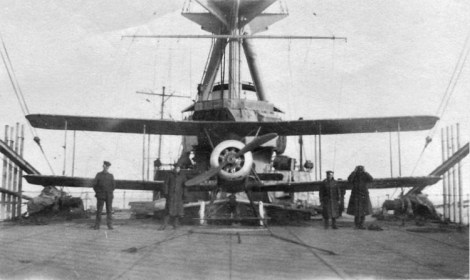 A wonderful image of a Griffin on HMS Vindictive’s flying off (forward) deck in 1919. Note the wooden palisades to either side used as a windbreak for flying off operations, and the considerable slope of the deck. Thanks to David Bull for use of the image
