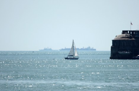 HMS Illustrious appearing above the horizon off Portsmouth as she returns home for the last time