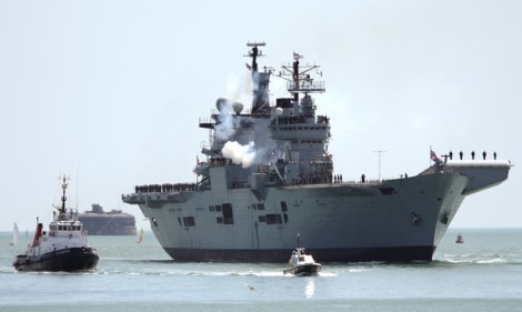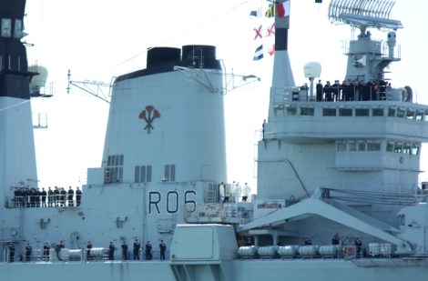 Illustrious’ crew line the rails as she returns to Portsmouth for the last time