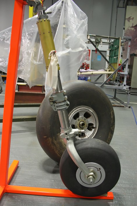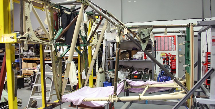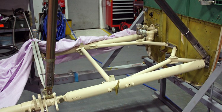 A good place to see this approach is on the forward fuselage, which is an immensely complicated (some might say over-complicated) structure made up of steel tubes of different sizes, gauges and tapers, attached with specific tube-end fittings or gusset plates that are bolted or riveted together. In certain cases the tubes might no longer be useable (it’s worth saying here that tubes in a seemingly poor state, e.g. cracked or bent, have been successfully returned to something like their former condition) but the end fittings will be. This section of the aircraft is the focal point of the main efforts so far, but is by no means the only area where work is ongoing. One of the massive undercarriage units has been successfully reconstructed and has reached the stage of being primed. It more or less only needs to be painted and have the gear leg fairings fitted for it to be finished.